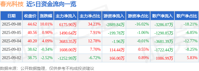 9月8日的资金流向数据方面,主力资金净流入6175.9万元,占总成交额34.23%,游资资金净流出2889.84万元,占总成交额16.02%,散户资金净流出3286.07万元金谷子,占总成交额18.21%。