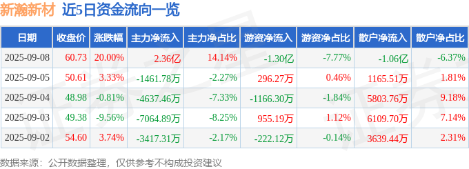 证券之星消息,新瀚新材9月8日涨停收盘,收盘价60.73元。该股于11点24分涨停,未打开涨停客新策略,截止收盘封单资金为1.54亿元,占其流通市值2.31%。