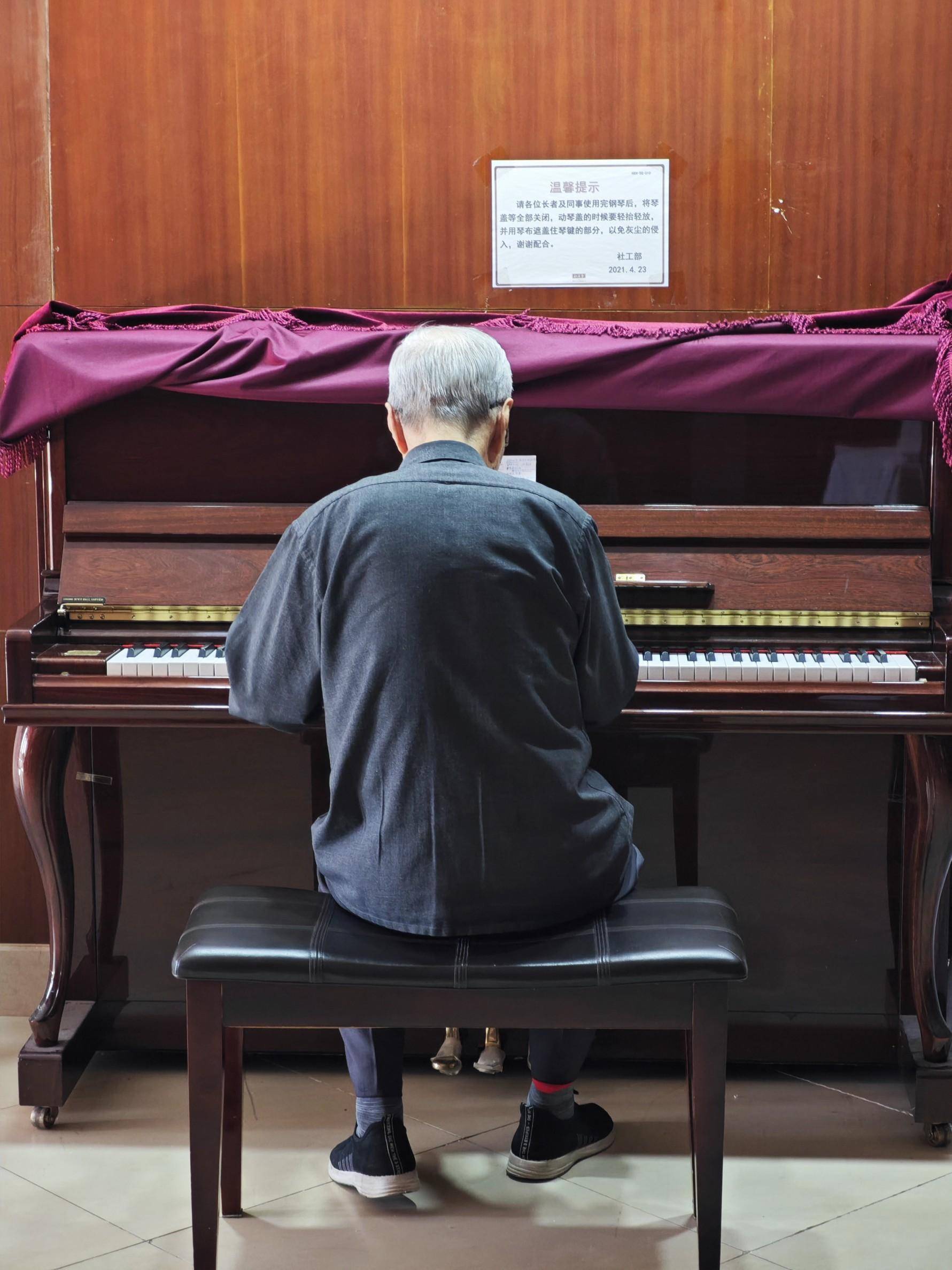 老人正在弹钢琴。人民网记者 王天乐摄人民网北京11月19日电 (记者王天乐、车柯蒙)“到点了,该去学习禅舞了。”近日,北京一家养老机构内,杨和争奶奶拿起扇子走进活动中心,十点出头,教室里已聚集了十多位老人。